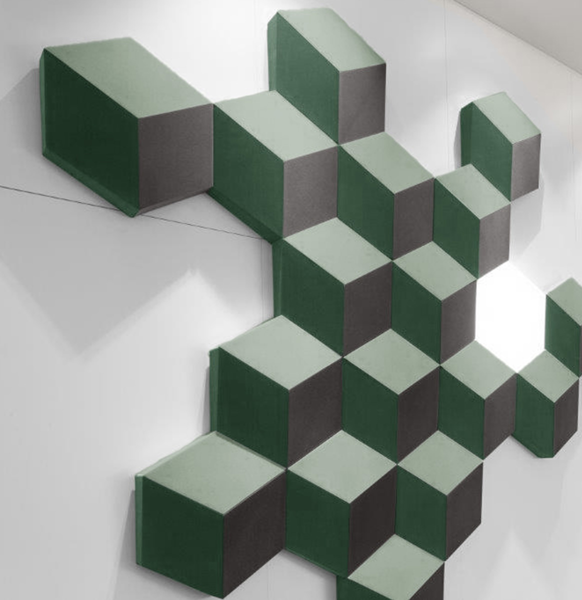 Chaque modèle est composé d’unités individuelles (6 faces) à agencer suivant un schéma répétitif ou au contraire suivant des dimensions et des formes aléatoires. Grâce à cette flexibilité, ce modèle s’adapte facilement aux plafonds et murs pourvus de système d’aération, de fenêtre, de système d’éclairage,… mais aussi aux surfaces irrégulières.
