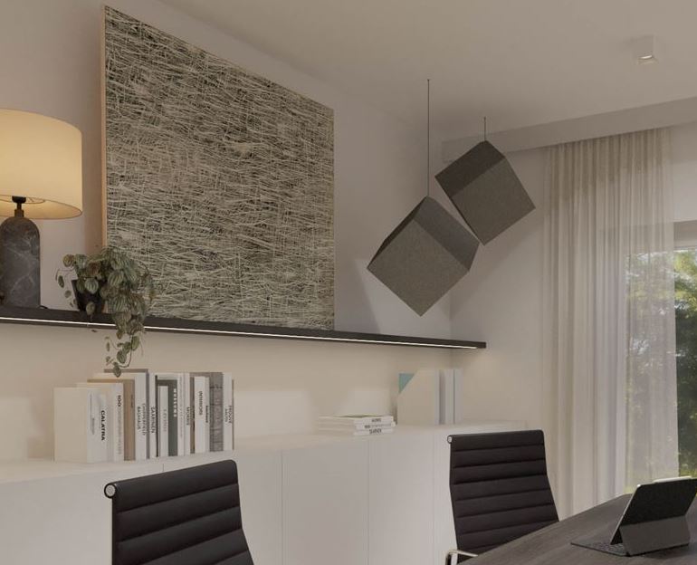 Door het plaatsen van afgehangen Akomo kubussen zal het rond stuiterende geluid snel worden geabsorbeerd, waardoor de ruimte niet langer een holle klank heeft.